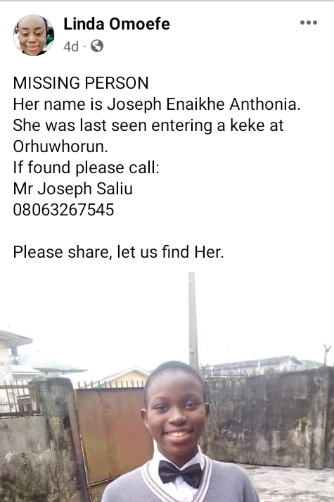 The girl was last seen after she boarded a commercial tricycle at Orhuwhorun in Udu Local Government Area of the state.