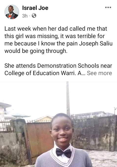 “Last week when her dad called me that this girl was missing, it was terrible for me because I know the pain Joseph Saliu would be going through,” he wrote.