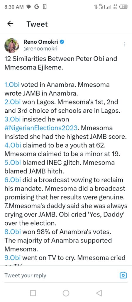 3.Obi insisted he won #NigerianElections2023. Mmesoma insisted she had the highest JAMB score.