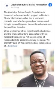 The foundation said, “The Abubakar Bukola Saraki Foundation is honoured to have extended support to Mr John Okafor also known as Mr. Ibu, a renowned comedic icon who has graced our screens and brought joy and laughter to countless homes over the past four decades.