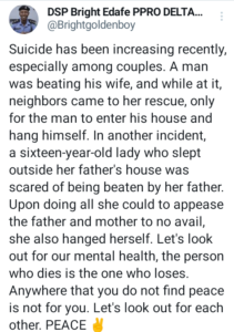 The spokesperson of the Delta State Police Command, DSP Bright Edafe, has raised alarm over increasing rate of suicide, especially among couples.