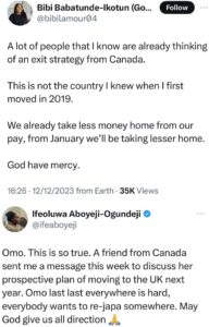 In a post shared on X, the lady said Canada is no longer as it was when she moved there in 2019. She said they already take less money from their pay every month and that from January 2024, the money will be less.