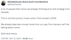 In a post shared on X, the lady said Canada is no longer as it was when she moved there in 2019. She said they already take less money from their pay every month and that from January 2024, the money will be less.