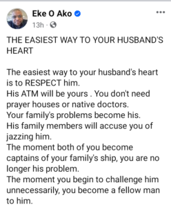 “The easiest way to your husband’s heart is to RESPECT him. His ATM will be yours . You don’t need prayer houses or native doctors,” he wrote in a Facebook post on Saturday, December 23.