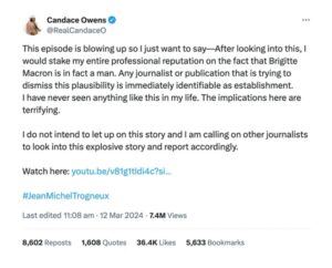 On March 11, 2024, conservative political commentator Candace Owens brought the allegations to a new audience in the United States. Owens repeated the rumors in great detail on her podcast, citing Pressibus — a French site that previously peddled unfounded hypotheses about the COVID-19 pandemic — as a source. She shared a link to her podcast on X (former Twitter); the post was seen 7.4 million times, received 36,400 likes, and amplified more than 10,000 times as of this writing.