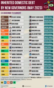 Other former governors in the list and the domestic debt inherited by their successors include Udom Gabriel Emmanuel of Akwa Ibom state, N199.58 billion; Samuel Ortom of Benue State, N186.94 billion; Simon Lalong of Plateau State, N157.62 billion; Okezie Ikpeazu of Abia State, N142.47 billion; Abdullahi Ganduje of Kano State, N122.36 billion; Abubakar Bello of Niger State, N121.95 billion and Bello Matawalle of Zamfara State, N96.31 billion.