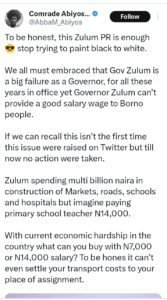 X user, Comrade Abiyos Roni has alleged that the beloved Governor of Borno State, Prof. Babagana Zulum pays 14,000 (fourteen thousand naira) as minimum wage to primary school teachers in the state.