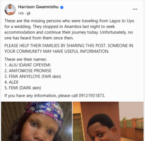 Human rights activist, Harrison Gwamnishu, who posted photos of the individuals in a Facebook post on Wednesday, May 21, 2025, said they left Lagos for Uyo, Akwa Ibom State for a wedding but became unreachable after a stopover in Anambra State.