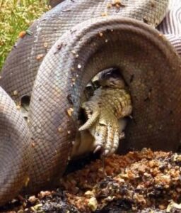 A terrific arrangement of photographs shows an olive python, gulping down an Australian freshwater crocodile